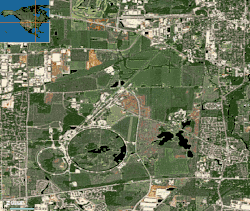 A satellite view of Fermilab. The two circular structures are the Main Injector Ring (smaller) and Tevatron (larger).