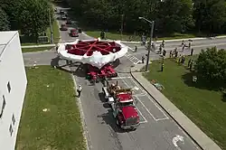 Fermilab's Main Injector, two miles (3.3 km) in circumference, is the laboratory's most powerful particle accelerator.[2] The accelerator complex that feeds the Main Injector is under upgrade, and construction of the first building for the new PIP-II linear accelerator began in 2020.[3] Until 2011, Fermilab was the home of the 6.28 km (3.90 mi) circumference Tevatron accelerator. The ring-shaped tunnels of the Tevatron and the Main Injector are visible from the air and by satellite.