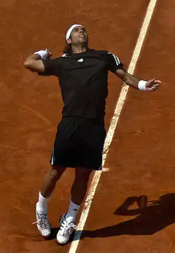 Fernando Francisco González Ciuffardi (Latin American Spanish: [feɾˈnando ɣonˈsales];[a] born 29 July 1980) is a Chilean former professional tennis player. During his career, he reached at least the quarterfinals of all four major tournaments. He contested his only major final at the 2007 Australian Open, losing to top-seeded Roger Federer. González is the fourth man in history to have won an Olympic tennis medal in every color, with gold in doubles and bronze in singles at Athens 2004, and silver in singles at Beijing 2008. The gold medal that González won partnering Nicolás Massú at the 2004 Olympics in men's doubles was Chile's first-ever Olympic gold medal. During his career, González defeated many top players, including Lleyton Hewitt, Andre Agassi, Roger Federer (all while they held the top spot), Novak Djokovic, Rafael Nadal, Andy Roddick, Juan Carlos Ferrero, Carlos Moyá, Gustavo Kuerten, Marat Safin, Pete Sampras, and Andy Murray. González qualified twice for the year-end Masters Cup event and was runner-up at two Masters Series tournaments. González was known for having one of the strongest forehands on the tour.[1] In Spanish he is nicknamed El Bombardero de La Reina ("The Bomber from La Reina") and Mano de Piedra ("Hand of Stone").