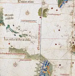 A fourth possibility is that it was discovered by the Third India Armada of João da Nova, which set out from Lisbon in March or April 1501, and returned in September 1502, also in time to influence the Cantino map. Chronicler Gaspar Correia asserts that on the outward voyage, the Third Armada made a stop on the Brazilian coast around Cape Santo Agostinho.[15] Two other chroniclers (João de Barros and Damião de Góis) do not mention a landfall, but do report they discovered an island (which they believe to be identified as Ascension Island, but this is not certain).[16] It is thus possible that the Third Armada may have discovered Fernando de Noronha island on their outward leg. However, the timing is very tight: Easter landed on April 11, 1501, while the estimated departure date of the Third Armada from Lisbon ranges from March 5 to April 15, not leaving enough time to reach those environs within Lent.