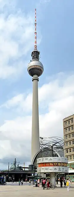 It remains a landmark today from its position next to Alexanderplatz in the city's Marien Quarter, part of the district of Mitte, visible across most suburban districts of Berlin.[1] With a height of 368 metres (1,207 ft) (including antenna) it is the tallest structure in Germany, and the third-tallest structure in the European Union. When built it was the fourth-tallest freestanding structure in the world after the Empire State Building and the John Hancock Center.[2]