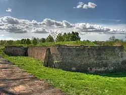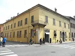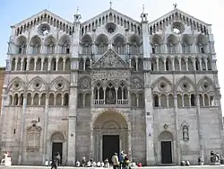 There is uncertainty among scholars about the proposed Roman origin of the settlement in its current location (Tacitus and Boccaccio refer to a "Forum Alieni"[7]), for little is known of this period,[8] but some archeologic evidence points to the hypothesis that Ferrara could have been originated from two small Byzantine settlements: a cluster of facilities around the Cathedral of St. George, on the right bank of the main branch of the Po, which then ran much closer to the city than today, and a castrum, a fortified complex built on the left bank of the river to defend against the Lombards.[9]