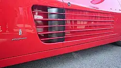 The styling was a departure from the curvaceous boxer—one which caused some controversy.[7] The side strakes sometimes referred to as "cheese graters"[7] or "egg slicers,"[10] that spanned from the doors to the rear fenders were needed for rules in several countries outlawing large openings on cars. Unlike the Berlinetta Boxer, the Testarossa had twin side radiators near the engine at the rear instead of a single radiator up-front - eliminating much piping and allowing for a much cooler cabin.[7][9] After passing through the engine bay, the cooling air exited through the vents at the engine lid and the tail. The strakes also made the Testarossa wider at the rear than at the front, thus increasing stability and handling.[2]