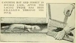 Muzzled ferret flushing a rat, as illustrated in Harding's Ferret Facts and Fancies (1915)