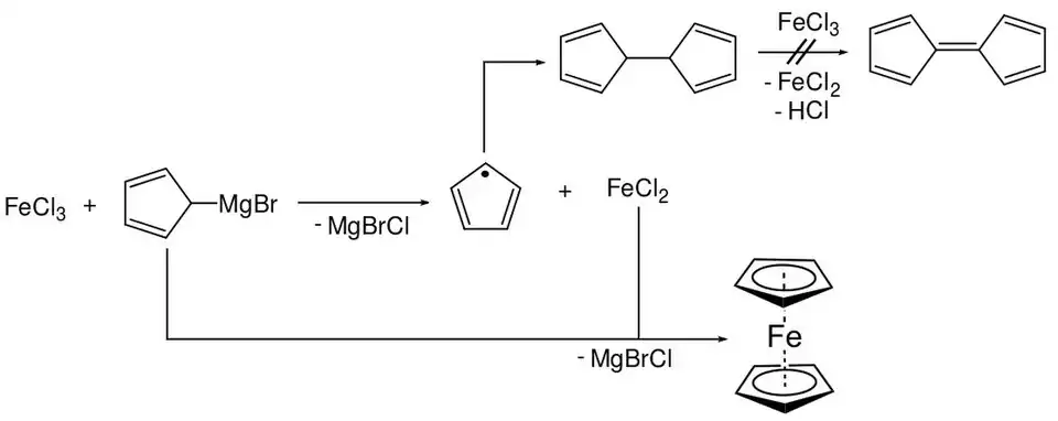 The first reported syntheses of ferrocene were nearly simultaneous. Pauson and Kealy synthesised ferrocene using iron(III) chloride and cyclopentadienyl magnesium bromide.[11] A redox reaction produces iron(II) chloride. The formation of fulvalene (the intended outcome), does not occur.[8]