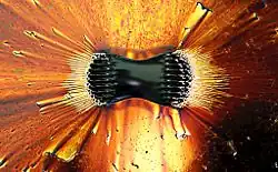 A process for making a ferrofluid was invented in 1963 by NASA's Steve Papell to create liquid rocket fuel that could be drawn toward a fuel pump in a weightless environment by applying a magnetic field.[4] The name ferrofluid was introduced, the process improved, more highly magnetic liquids synthesized, additional carrier liquids discovered, and the physical chemistry elucidated by R. E. Rosensweig and colleagues. In addition Rosensweig evolved a new branch of fluid mechanics termed ferrohydrodynamics which sparked further theoretical research on intriguing physical phenomena in ferrofluids.[5][6][7][8] In 2019, researchers at the University of Massachusetts and Beijing University of Chemical Technology succeeded in creating a permanently magnetic ferrofluid which retains its magnetism when the external magnetic field is removed. The researchers also found that the droplet's magnetic properties were preserved even if the shape was physically changed or it was divided.[9]