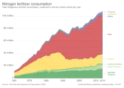 The invention of Haber process for producing ammonia for nitrogen in the 20th century combined with amplified chemical production capacity created during World War II led to a boom in using nitrogen fertilizers.[5] In the latter half of the 20th century, increased use of nitrogen fertilizers (800% increase between 1961 and 2019) has been a crucial component of the increased productivity of conventional food systems as part of the so-called "Green Revolution".[6]