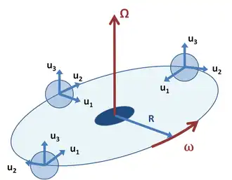Figure 4: An orbiting coordinate system B similar to Figure 3, but in which unit vectors uj, j = 1, 2, 3 rotate to face the rotational axis, while the origin of the coordinate system B moves at constant angular rate ω about the fixed axis Ω.