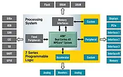 In 2012 the coarse-grained architectural approach was taken a step further by combining the logic blocks and interconnects of traditional FPGAs with embedded microprocessors and related peripherals to form a complete system on a programmable chip. Examples of such hybrid technologies can be found in the Xilinx Zynq-7000 all programmable SoC,[28] which includes a 1.0 GHz dual-core ARM Cortex-A9 MPCore processor embedded within the FPGA's logic fabric,[29] or in the Altera Arria V FPGA, which includes an 800 MHz dual-core ARM Cortex-A9 MPCore. The Atmel FPSLIC is another such device, which uses an AVR processor in combination with Atmel's programmable logic architecture. The Microsemi SmartFusion devices incorporate an ARM Cortex-M3 hard processor core (with up to 512 kB of flash and 64 kB of RAM) and analog peripherals such as a multi-channel analog-to-digital converters and digital-to-analog converters in their flash memory-based FPGA fabric.