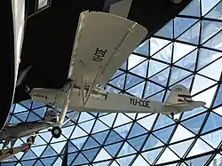The Fieseler Fi 156 Storch was a high-wing monoplane that was particularly effective in terms of its short take off and landing ("STOL") performance. Its nickname of Storch was derived from the lengthy legs of its main landing gear, which hung down during flight and gave the aircraft the appearance of a long-legged, big-winged bird. As a product of its relatively low landing speed, the Storch often gave the appearance of landing vertically, or even backwards, when flying directly into strong winds. The aircraft was typically crewed by three personnel seated with its enclosed cabin, which was extensively glazed as to provide generous external views.[10] The structure was composed of welded steel tubing while the covering was fabric. Both the tail unit and wings were composed of wood, the latter being clad in plywood.[4]
