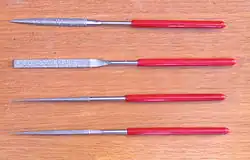 Files come in a wide variety of materials, sizes, shapes, cuts, and tooth configurations. The cross-section of a file can be flat, round, half-round, triangular, square, knife edge or of a more specialized shape.[5][6] Steel files are made from high carbon steel [7][8] (1.0 to 1.25% carbon) and may be through hardened[9] or case hardened.[10][11]