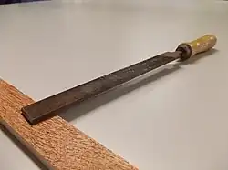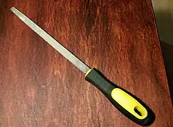 A file is a tool used to remove fine amounts of material from a workpiece. It is common in woodworking, metalworking, and other similar trade and hobby tasks. Most are hand tools, made of a case hardened steel bar of rectangular, square, triangular, or round cross-section, with one or more surfaces cut with sharp, generally parallel teeth. A narrow, pointed tang is common at one end, to which a handle may be fitted.[1]