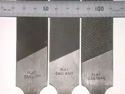 The cut of the file refers to how fine its teeth are. They are defined as (from roughest to smoothest): rough, middle, bastard, second cut, smooth, and dead smooth. A single-cut file has one set of parallel teeth while a cross-cut or double-cut file has a second set of cuts forming diamond shaped cutting surfaces.[1] In Swiss-pattern files the teeth are cut at a shallower angle, and are graded by number, with a number 1 file being coarser than a number 2, etc. Most files have teeth on all faces, but some specialty flat files have teeth on only one face or one edge, so that the user can come right up to another edge without damaging the finish on it.