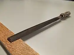 There is no unitary international standard for file nomenclature; however, there are many generally accepted names for certain kinds of files. A file is "blunt" if its sides and width are both parallel throughout its length.[2] It is "tapered" if there is a reduction in its dimensions from its heel toward its point. A file may taper in width, in thickness, or both.[2] A "tang" is a protrusion at the heel, tapered, parallel sided, or conical, for gripping, inserting in a handle, or mounting in a chuck.[2]