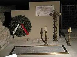 Brunelleschi's body lies in the crypt of the Cathedral of Florence. Antonio Manetti, who knew Brunelleschi and wrote his biography that Brunelleschi "was granted such honours as to be buried in the Basilica di Santa Maria del Fiore, and with a marble bust, which was said to be carved from life, and placed there in perpetual memory with such a splendid epitaph."[63] Inside the cathedral entrance is this epitaph: "Both the magnificent dome of this famous church and many other devices invented by Filippo the architect, bear witness to his superb skills. Therefore, in tribute to his exceptional talents, a grateful country that will always remember him buries him here in the soil below." A statue of Brunelleschi, looking up at his dome, was later placed in the square in front of the cathedral.