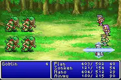 On the overworld and within dungeons, random encounters with enemies can be fought to improve each character's attributes.[4] Unlike the original Final Fantasy, players cannot upgrade their characters' classes. The game is also one of the few games in the series to not use experience-based levels. Instead, each character participating in battle develops depending on what actions they take. For instance, characters who frequently use a particular type of weapon will become more adept at wielding a weapon of that type, and will also increase in physical strength and accuracy.[3][4] Attributes include hit points, magic points, magic power, stamina, strength, spirit, agility, intelligence, and evasion. Hit points (HP) and magic points (MP) increase with their use; a character who takes a heavy amount of damage in a battle might earn an increase in maximum HP, while a character who uses a lot of MP during battle might increase their maximum MP.[4] This experience system had several unintended consequences that allowed characters to gain much more experience than intended, such as players having their characters attack each other and repeatedly cast spells, thus causing their HP and abilities to grow extensively.[3] Final Fantasy II uses the same turn-based battle system seen in the original Final Fantasy, with battle parties consisting of up to four characters at a time. The game introduces a "back row" in battle, within which characters or enemies are immune to most physical attacks, but can be harmed with bows and magical attacks.[1]