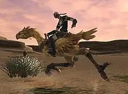 In addition to completing quests and missions, players can participate in several side-minigames and other activities.[10] One such minigame is fishing, where players can measure their strength against the fish they attempt to catch. Another is clamming, where players collect as many fish or sea creatures as possible without going over their bucket's size limit. Gardening allows players to raise plants in their residence, or "Mog House" as it is known in the game.[24] The raising and breeding of Chocobos was a long-requested activity enabled in the summer 2006 update.[25] Chocobo racing began in March 2007, which allowed for the racing of player-raised Chocobos against non-player characters (NPCs). Winning racers can earn "Chocobucks", which can be used to buy, for example, items that assist Chocobo breeding.[26]