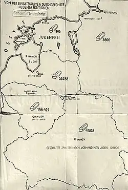 An Israeli historian Dina Porat claimed that the Final Solution, i.e.: "the systematic overall physical extermination of Jewish communities one after the other—began in Lithuania" during the massive German chase after the Red Army across the Reichskommissariat Ostland.[57] The subject of the Holocaust in Lithuania has been analysed by Konrad Kweit from USHMM who wrote: "Lithuanian Jews were among the first victims of the Holocaust [beyond the eastern borders of occupied Poland]. The Germans carried out the mass executions [...] signaling the beginning of the 'Final Solution'."[58] About 80,000 Jews were murdered in Lithuania by October (including in formerly Polish Wilno) and about 175,000 by the end of 1941 according to official reports.[57]
