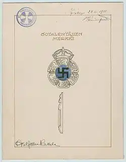 Swedish count Eric von Rosen gave the Finnish White government its second aircraft, a Thulin Typ D.[4] Von Rosen, later one of the founding members of the Nationalsocialistiska Blocket ("National Socialist Bloc"), a Swedish National Socialist political party, and brother-in-law to Hermann Goering,[5][6] had painted his personal good-luck charm on the Thulin Type D aircraft. This logo—a blue swastika, the ancient symbol of the sun and of good luck, which was back then still used with non-political connotations—gave rise to the insignia of the Finnish Air Force. The white circular background originated when the Finns painted over the advertisement from the Thulin air academy.[7] The swastika was officially taken into use after an order by Commander-in-Chief C. G. E. Mannerheim on 18 March 1918. The FAF changed its aircraft insignia, which resembled the swastika of the Third Reich, after 1944 due to an Allied Control Commission decree,[8] which prohibited fascist organizations.[8] It nevertheless continues to feature in some unit emblems, unit flags and decorations, including on uniforms. In 2020, the BBC reported that the FAF had "quietly stopped" using the symbol in the emblem of the Air Force Command.[9]