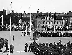 The war has been assigned several designations according to different political and ideological viewpoints. War of Independence (Finnish: vapaussota) was used during the war by both sides to express the fight for liberation from capitalism for the Reds and freedom from Soviet Russian influence by the Whites; Civil War is the term increasingly employed by the reconstituted social democrats after their defeat in the war.[6] The general terms for the conflict, Civil War (Finnish: sisällissota) and Citizen War (Finnish: kansalaissota), are synonymous and appeared mostly after the war. More ideologic names were also used including Class War (Finnish: luokkasota) and Revolution (Finnish: vallankumous) by the Reds and their supporters while Red Rebellion (Finnish: punakapina) was used by the Whites and their supporters.[7] Another designation, Brethren War (Finnish: veljessota), is applied in some poetic settings.[8] According to a 2008 interview of 1,005 people done by the newspaper Aamulehti, the most popular names were as follows: Civil War: 29%, Citizen War: 25%, Class War: 13%, War of Independence: 11%, Red Rebellion: 5%, Revolution: 1%, other name: 2% and no answer: 14%.[9]