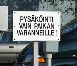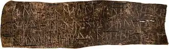 The Birch bark letter no. 292 from the early 13th century is the first known document in any Finnic language; it is written in a variety that is closest to modern Karelian or Veps.[27] The first known written example of Finnish itself is found in a German travel journal dating back to c. 1450: Mÿnna tachton gernast spuho sommen gelen Emÿna daÿda (Modern Finnish: "Minä tahdon kernaasti puhua suomen kielen, [mutta] en minä taida;" English: "I want to speak Finnish, [but] I am not able to").[28] According to the travel journal, the words are those of a Finnish bishop whose name is unknown. The erroneous use of gelen (Modern Finnish kielen) in the accusative case, rather than kieltä in the partitive, and the lack of the conjunction mutta are typical of foreign speakers of Finnish even today.[29] At the time, most priests in Finland spoke Swedish.[30]