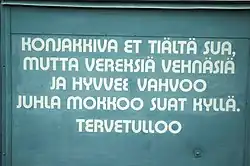 A sign in Savonian dialect: "You don't get cognac here, but fresh wheat buns and good strong Juhla Mokka-brand coffee you will have. Welcome."