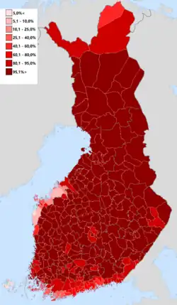 Share of Finnish speakers in the population of municipalities of Finland in 2020.[11]