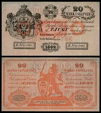 20 mk banknote issued in 1862 for the Grand Duchy of Finland. The banknote's obverse depicts the coat of arms of Finland on a Russian double-headed eagle, and was personally signed by the director and the cashier of the Bank of Finland. The text on the obverse is in Swedish, whereas the reverse is primarily in Russian and Finnish.