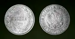 A silver markka coin used in the autonomous Grand Duchy of Finland from 1864 to 1915. The obverse of the coin (shown on the right) features the double-headed eagle of Russia, with the coat of arms featuring a lion depicted at the centre.