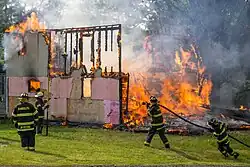 ![]() A firefighter team work together to contain a blazing barn | |
