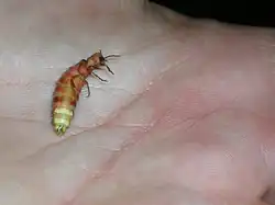 The larvae feed until the end of the summer. Most fireflies hibernate as larvae. Some do this by burrowing underground, while others find places on or under the bark of trees. They emerge in the spring. At least one species, Ellychnia corrusca, overwinters as an adult.[10] The larvae of most species are specialized predators and feed on other larvae, terrestrial snails, and slugs. Some are so specialized that they have grooved mandibles that deliver digestive fluids directly to their prey. The larval stage lasts from several weeks up to, in certain species, two or more years.[11] The larvae pupate for one to two and a half weeks and emerge as adults.[8]