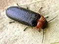 The Lampyridae are a family of elateroid beetles with more than 2,400 described species,[5] many of which are light-emitting. They are soft-bodied beetles commonly called fireflies, lightning bugs, or glowworms for their conspicuous production of light, mainly during twilight, to attract mates.[6] The type species is Lampyris noctiluca, the common glow-worm of Europe. Light production in the Lampyridae is thought to have originated as a warning signal that the larvae were distasteful. This ability to create light was then co-opted as a mating signal and, in a further development, adult female fireflies of the genus Photuris mimic the flash pattern of the Photinus beetle to trap their males as prey.