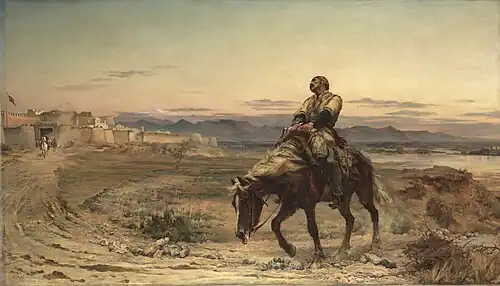 When Governor-General of India Lord Auckland heard about the arrival of Russian envoy Count Jan Prosper Witkiewicz (better known by the Russian version of his name as Yan Vitkevich) in Kabul and the possibility that Dost Mohammad might turn to Russia for support, his political advisers exaggerated the threat.[5] Alexander Burnes, the Scotsman who served as the East India Company's chief political officer in Afghanistan, described Witkiewicz: "He was a gentlemanly and agreeable man, of about thirty years of age, spoke French, Turkish and Persian fluently, and wore the uniform of an officer of the Cossacks".[17] The presence of Witkiewicz had thrown Burnes into a state of despair, leading one contemporary to note that he "abandoned himself to despair, bound his head with wet towels and handkerchiefs and took to the smelling bottle".[17] Dost Mohammad had in fact invited Count Witkiewicz to Kabul as a way to frighten the British into making an alliance with him against his archenemy Ranjit Singh, the Maharaja of the Punjab, not because he really wanted an alliance with Russia. The British had the power to compel Singh to return the former Afghan territories he had conquered whereas the Russians did not, which explains why Dost Mohammad Khan wanted an alliance with the British. Burnes wrote home after having dinner with Count Witkiewicz and Dost Mohammad in late December 1837: "We are in a mess home. The emperor of Russia has sent an envoy to Kabul to offer...money [to the Afghans] to fight Rajeet Singh!!! I could not believe my own eyes or ears."[16] On 20 January 1838, Lord Auckland sent an ultimatum to Dost Mohammad telling him: "You must desist from all correspondence with Russia. You must never receive agents from them, or have aught to do with them without our sanction; you must dismiss Captain Viktevitch [Witkiewicz] with courtesy; you must surrender all claims to Peshawar".[18] Burnes himself had complained that Lord Auckland's letter was "so dictatorial and supercilious as to indicate the writer's intention that it should give offense", and tried to avoid delivering it for long as possible.[19] Dost Mohammad was indeed offended by the letter, but in order to avoid a war, he had his special military advisor, the American adventurer Josiah Harlan, engage in talks with Burnes to see if some compromise could be arranged.[20] Burnes in fact had no power to negotiate anything, and Harlan complained that Burnes was just stalling, which led to Dost Mohammad expelling the British diplomatic mission on 26 April 1838.[20]