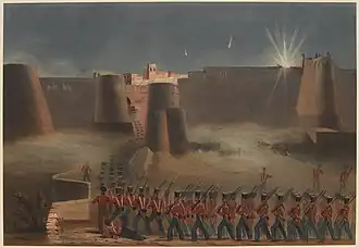 Lithograph depicting British-Indian force storming the fortress during the Battle of Ghazni, 23 July 1839