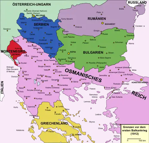 ![]() Clockwise from top right: Serbian forces entering the town of Mitrovica; Ottoman troops at the Battle of Kumanovo; Meeting of the Greek king George I and the Bulgarian tsar Ferdinand I in Thessaloniki; Bulgarian heavy artillery | |||||||||