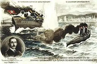 Nevertheless, at the outbreak of the war, the Greek fleet was far from ready. The Ottoman battlefleet retained a clear advantage in the number of ships, speed of the primary surface units and, most importantly, the number and calibre of the ships' guns.[35] In addition, as the war caught the fleet in the middle of its expansion and reorganization, a full third of the fleet (the six new destroyers and the submarine Delfin) reached Greece only after hostilities had started, forcing the navy to reshuffle crews, who consequently suffered from lacking familiarity and training. Coal stockpiles and other war stores were also in short supply, and the Georgios Averof had arrived with barely any ammunition and remained so until late November.[36]