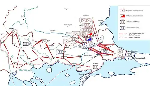On the Thracian Front, the Bulgarian army had placed 346,182 men against the Ottoman First Army, with 105,000 men in eastern Thrace and the Kircaali detachment, of 24,000 men, in western Thrace. The Bulgarian forces were divided into the First, Second and Third Bulgarian Armies of 297,002 men in the eastern part and 49,180 (33,180 regulars and 16,000 irregulars) under the 2nd Bulgarian Division (General Stilian Kovachev) in the western part.[54] The first large-scale battle occurred against the Edirne-Kırklareli defensive line, where the Bulgarian First and Third Armies (a combined 174,254 men) defeated the Ottoman East Army (of 96,273 combatants),[54][55] near Gechkenli, Seliolu and Petra. The Ottoman XV Corps urgently left the area to defend the Gallipoli Peninsula against an expected Greek amphibious assault, which never materialized.[56] The absence of the corps created an immediate vacuum between Adrianople and Demotika, and the 11th Infantry Division from the Eastern Army's IV Corps was moved there to replace it. Thus, one complete army corps was removed from the Eastern Army's order of battle.[56]
