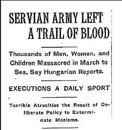 - ^ Geshov, Ivan Evstratiev (1919). La genèse de la guerre mondiale: la débâcle de l'alliance balkanique (in French) (as for example that of the Serbian deputy Triša Kaclerovićh, who, in an article published in 1917 by the International Bulletin, affirms that in 1912–1913 120,000 Albanians were massacred by the Serbian army ed.). P. Haupt. p. 64. Retrieved 9 August 2023.