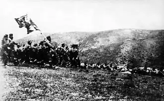 Due to poor organization, transportation problems and the protracted war with Italy, the Ottoman order of battle only had 12,024 officers, 324,718 other ranks, 47,960 animals, 2,318 artillery pieces and 388 machine guns ready by early October instead of the planned full complement of 750,000 officers and soldiers.[22] A total of 920 officers and 42,607 men of them had been assigned to non-divisional units and services, the remaining 293,206 officers and men were assigned to four armies.[23]
