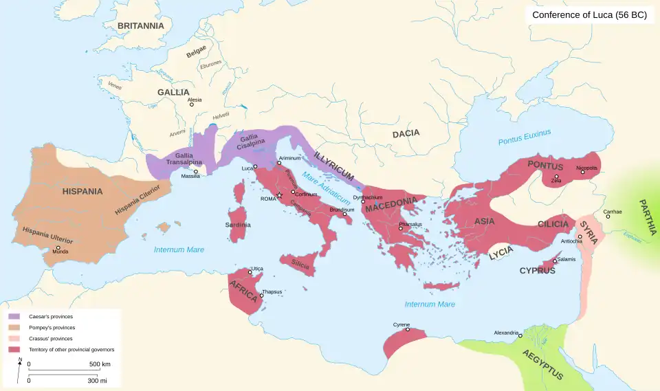Some two hundred senators, mostly of lower rank, attended upon the three men, seeking to ingratiate themselves.[140] The conference also forced a re-evaluation of alliances across the wider aristocracy: the Claudii – both Appius and Publius – and Gaius Cato switched sides back to the dynasts. Cicero, dependent on and indebted to Pompey for his return from exile, was also enlisted to lend rhetorical support.[139] The alliance was renewed and expanded to include the Claudii Pulchri, turning Clodius from an opponent to a supporter.[141] In return for their help, the allies would support Appius – whose chances of election to a consulship without their support was slim – in his goal of being elected consul for 54.[142] The remaining opposition was also further reinvigorated. Cato had returned from a provincial assignment in Cyprus in late 56 and supported Domitius' campaign for the consulship. After 55 BC, when Pompey and Crassus assumed a joint consulship by violence, the political fortunates of the triple alliance quickly soured.[139]