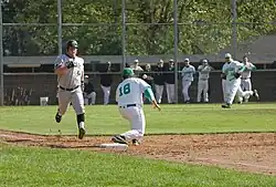 A high school first baseman takes a throw from the third baseman in an attempt to have the runner called "out".