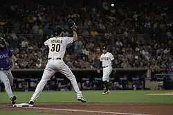 Eric Hosmer of the San Diego Padres, an example of a left-handed throwing first baseman.