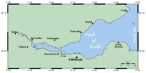 The Firth of Forth (Scottish Gaelic: Linne Foirthe) is a firth in Scotland, an inlet of the North Sea that separates Fife to its north and Lothian to its south. Further inland, it becomes the estuary of the River Forth and several other rivers.[2]