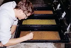 Although fish farming for food is the most widespread, another major fish farming industry provides living fish for the aquarium trade. The vast majority of freshwater fish in the aquarium trade originate from farms in Eastern and Southern Asia, eastern Europe, Florida and South America that use either indoor tank systems or outdoor pond systems, while farming of fish for the marine aquarium trade happens at a much smaller scale.[8] In 2022 24% of fishers and fish farmers and 62% of workers in post-harvest sector were women.[9][10]