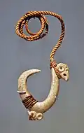 The fish hook or similar angling device has been made by humans for many thousands of years. The earliest prehistoric tackle is known as a gorge, which consisted of a double-pointed stick with a thin rope tied to the middle. When angling, the gorge is laid parallel to the line and buried inside a bait ball, which can be swallowed easily by the fish.[2] Once inside the fish's mouth, the bait ball often softens and gets fragmented by the pharyngeal teeth, and any pulling along the line will cause the freed-up gorge to rotate transversely and get stuck across the fish's gullet, similar to how a fish bone or chicken bone may pierce and obstruct a man's esophagus.[3] They performed similar anchoring functions to hooks, but needed both ends to claw firmly into the fish's gullet to work properly.