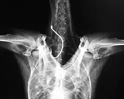 Veterinary X-ray of a fish hook stuck in the crop of an unidentified species of cormorant