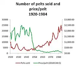 Prices for pelts have varied considerably over the past 100 years. They were highest in the 1920s and 1930s, when average prices were about US$100.[6] In 1936, pelts were being offered for sale in New York City for $450–750 per pelt.[72] Prices declined through the 1960s, but picked up again in the late 1970s. In 1979, the Hudson's Bay Company paid $410 for one female pelt.[72] In 1999, 16,638 pelts were sold in Canada for C$449,307 at an average price of $27.[73]