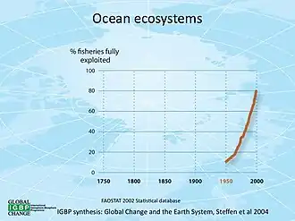 The environmental impact of fishing includes issues such as the availability of fish, overfishing, fisheries, and fisheries management; as well as the impact of industrial fishing on other elements of the environment, such as bycatch.[30] These issues are part of marine conservation, and are addressed in fisheries science programs. According to a 2019 FAO report, global production of fish, crustaceans, molluscs and other aquatic animals has continued to grow and reached 172.6 million tonnes in 2017, with an increase of 4.1 percent compared with 2016.[31] There is a growing gap between the supply of fish and demand, due in part to world population growth.[32]