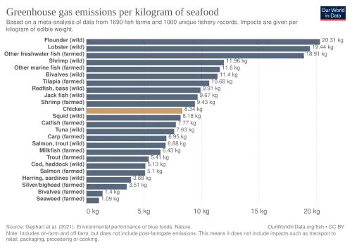 Greenhouse gas emissions (kg / kg edible weight) of wild-caught and farmed seafood products