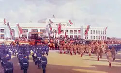 In the decades following federation the red ensign was the pre-eminent flag in use by private citizens on land. This was largely due to the Commonwealth Government, assisted by flag suppliers, discouraging the use of the blue ensign by the general public.[62] Both the blue and red versions were used by armed forces during the First and Second World Wars (see: Flags of the Australian Defence Force).[63] A colourised version of a photograph held by the Australian War Memorial of the Armistice Day celebrations in Sydney's Martin Place, 11 November 1918, reveals both ensigns being displayed by the assembled crowd.[64][65] Illustrations and photos of the opening of Australia's provisional Parliament House in 1927 show Australian Ensigns flown alongside Union Jacks. However, sources disagree on the colours of the Australian flags, leaving open the possibility that either ensign or both were used.[59][66][67]